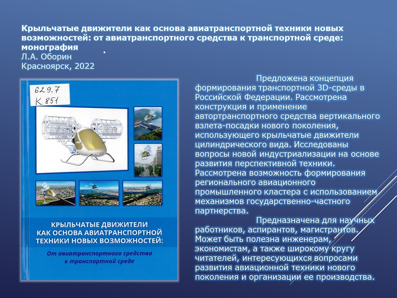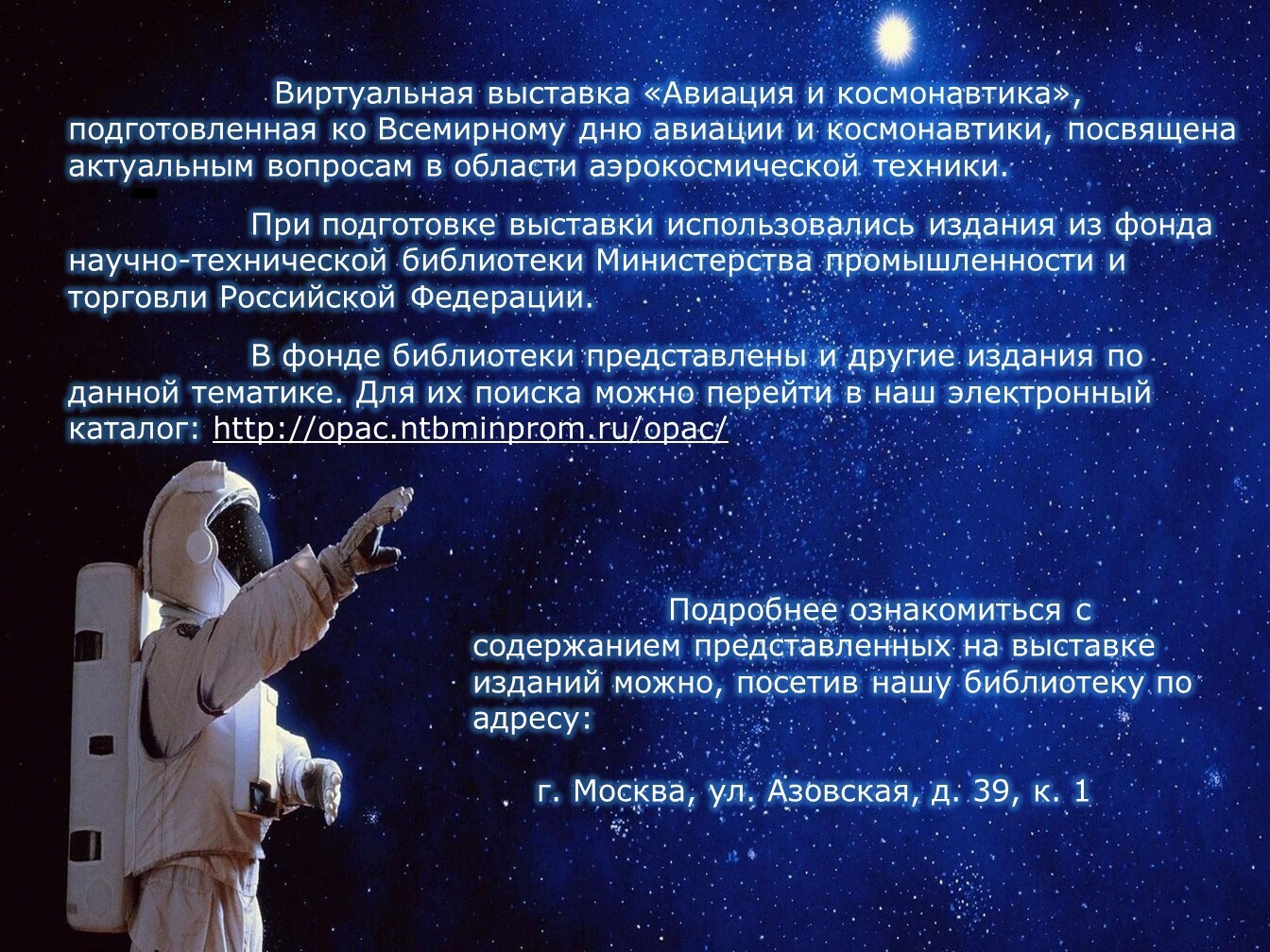 Авиация и космонавтика. Виртуальная книжная выставкаУважаемые подписчики и гости нашего сайта!Сегодня мы предлагаем вашему вниманию виртуальную книжную выставку «Авиация и космонавтика», подготовленную ко Всемирному дню авиации и космонавтики. Авиация и космонавтика играют ключевую роль в нашем обществе, обеспечивая связь, безопасность и новые горизонты для исследований. Авиационная промышленность России — крупная отрасль российского машиностроения, осуществляющая разработку и производство авиационной техники. В сфере самолётостроения Россия выпускает истребители, бомбардировщики, учебно-боевые, военно-транспортные, пассажирские самолёты, в сфере вертолётостроения — транспортные и боевые вертолёты. Также осуществляется выпуск беспилотных летательных аппаратов. Космическая отрасль России занимается разработкой и производством космических аппаратов. Крупнейшим предприятием космической отрасли России является РКК «Энергия», главный подрядчик пилотируемых космических полётов. Надеемся, что представленная информация будет вам полезна.