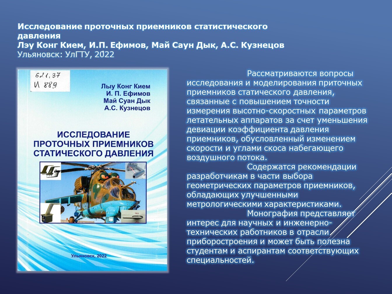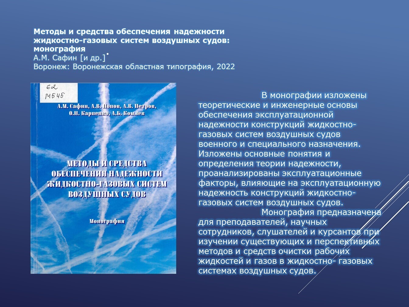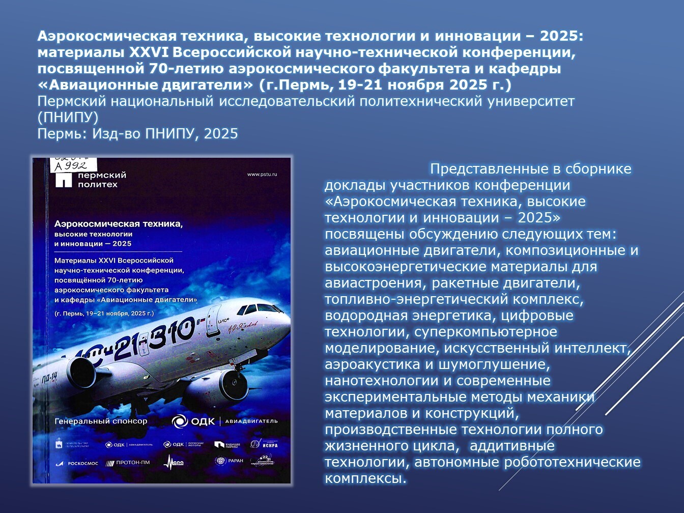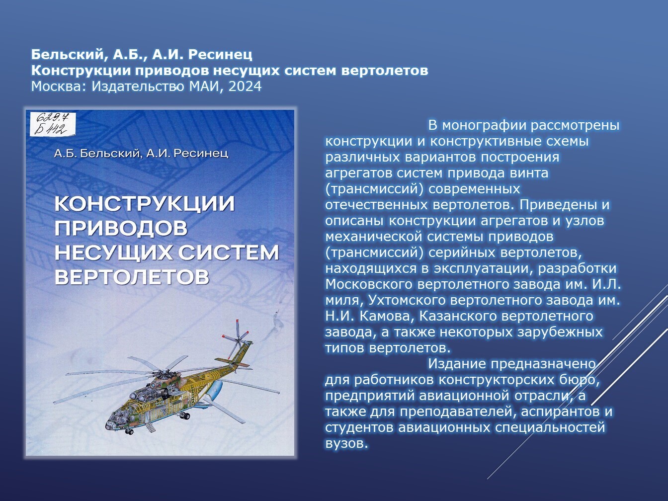 Книги, задействованные в публикации из фонда НТБ (запрашивайте книги по электронной почте ntb@minprom.gov.ru или через электронный каталог)1. Аэрокосмическая техника, высокие технологии и инновации – 2025: материалы XXVI Всероссийской научно-технической конференции, посвященной 70-летию аэрокосмического факультета и кафедры «Авиационные двигатели» (г. Пермь, 19 – 21 ноября 2025 г.) / Пермский национальный исследовательский политехнический университет (ПНИПУ). – Пермь: Изд-во ПНИПУ, 2025. – 353 с. – URL: http://opac.ntbminprom.ru/opac/index.php?url=/notices/index/822727/default/392920 2. Бельский, А.Б. Конструкции приводов несущих систем вертолетов /А.Б. Бельский, А.И. Ресинец. – Москва: Издательство МАИ, 2024. – 316 с.: ил.. - URL: http://opac.ntbminprom.ru/opac/index.php?url=/notices/index/805261/default/392921 3. Исследование проточных приемников статистического давления / Конг Кием Лэу, И.П. Ефимов, Май Саун Дык, А.С. Кузнецов. – Ульяновск: УлГТУ, 2022. – 262 с. - URL: http://192.168.1.21/opac_pb/index.php?url=/notices/index/494949/default/89 4. Крыльчатые движители как основа авиатранспортной техники новых возможностей: от авиатранспортного средства к транспортной среде: монография / Л.А. Оборин [и др.]. – Красноярск, 2022. – 180 с. - URL: http://192.168.1.21/opac_pb/index.php?url=/notices/index/494984/default/90 5. Еськов, А.В. Приборы и методы оптического контроля параметров импульсных дисперсных потоков: монография А.В. Еськов, Ю.С. Медведев. – Краснодар: КВВАУЛ, 2022. – 222 с. - URL: http://192.168.1.21/opac_pb/index.php?url=/notices/index/495258/default/91 6. Методы и средства обеспечения надежности жидкостно-газовых систем воздушных судов: монография / А.М. Сафин [и др.]. – Воронеж: АО «Воронежская областная типография», 2022. – 232 с. - URL: http://192.168.1.21/opac_pb/index.php?url=/notices/index/495291/default/94 Источники, использованные при создании публикации: |