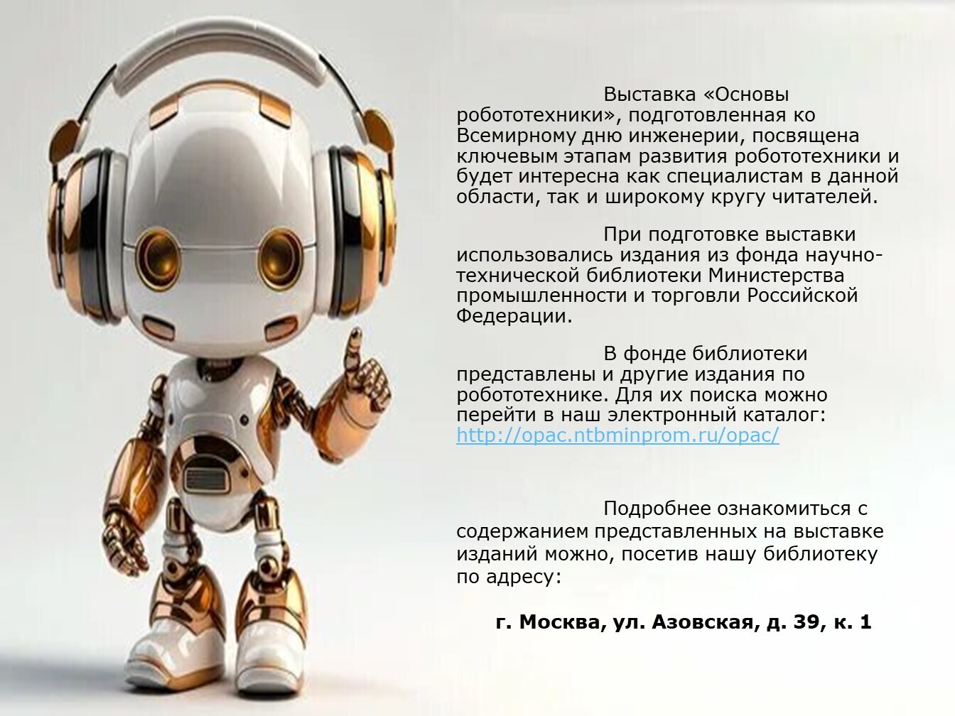 Основы робототехники. Виртуальная книжная выставкаУважаемые подписчики и гости нашего сайта!Сегодня мы предлагаем вашему вниманию виртуальную книжную выставку «Основы робототехники», подготовленную ко Всемирному дню инженерии. Всемирный день инженерии отмечают 4 марта. Это событие будет отмечаться в мире в 2026 году в седьмой раз. Профессиональный праздник для всех инженеров, ученых и изобретателей установили осенью 2019 года на Генеральной конференции ЮНЕСКО по инициативе Всемирной федерации инженерных организаций. В этот день в 1968 году была образована World Federation of Engineering Organizations (WFEO) — международная неправительственная организация, представляющая профессию инженера по всему миру. В нее входит и Российский союз научных и инженерных общественных объединений. Цель праздника — повысить популярность профессии инженера и отдать дань уважения специалистам, без которых было бы невозможным развитие промышленности и строительства. Надеемся, что представленная информация будет вам полезна.