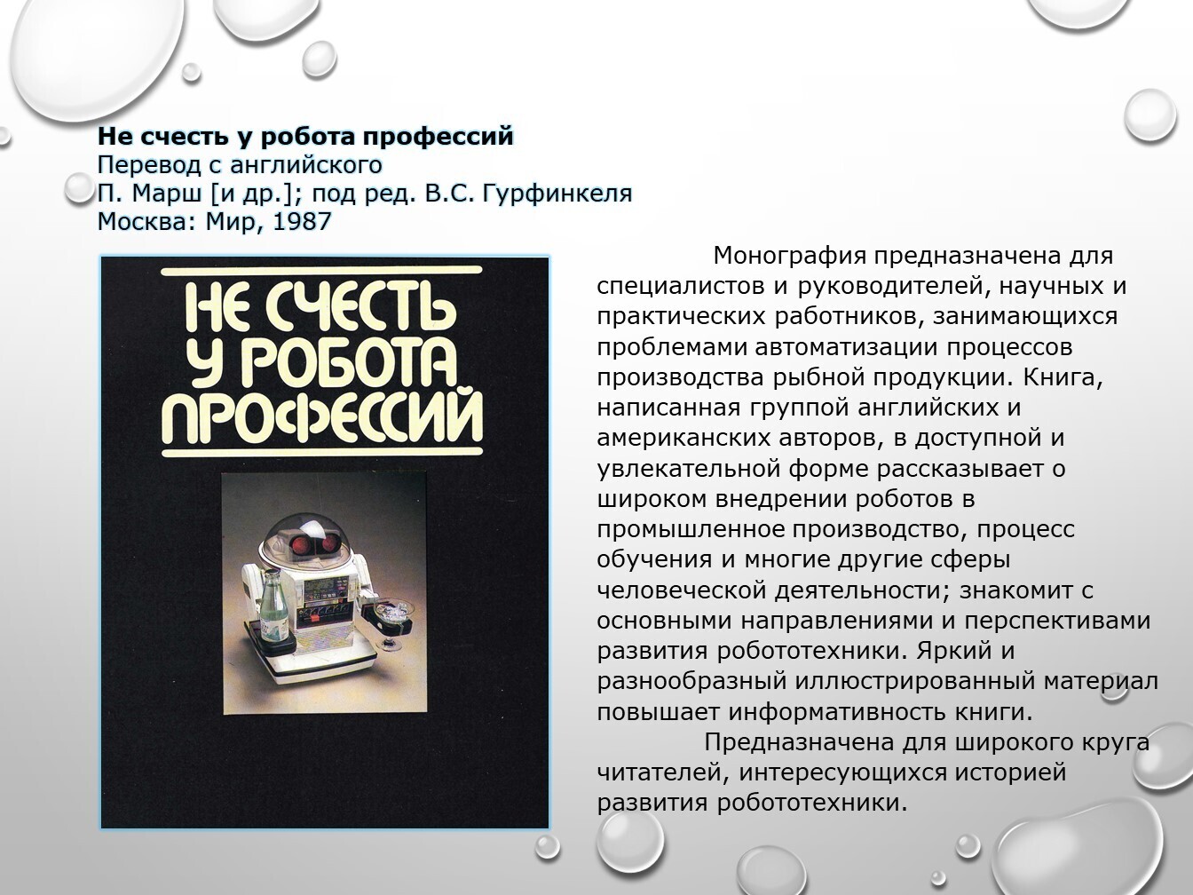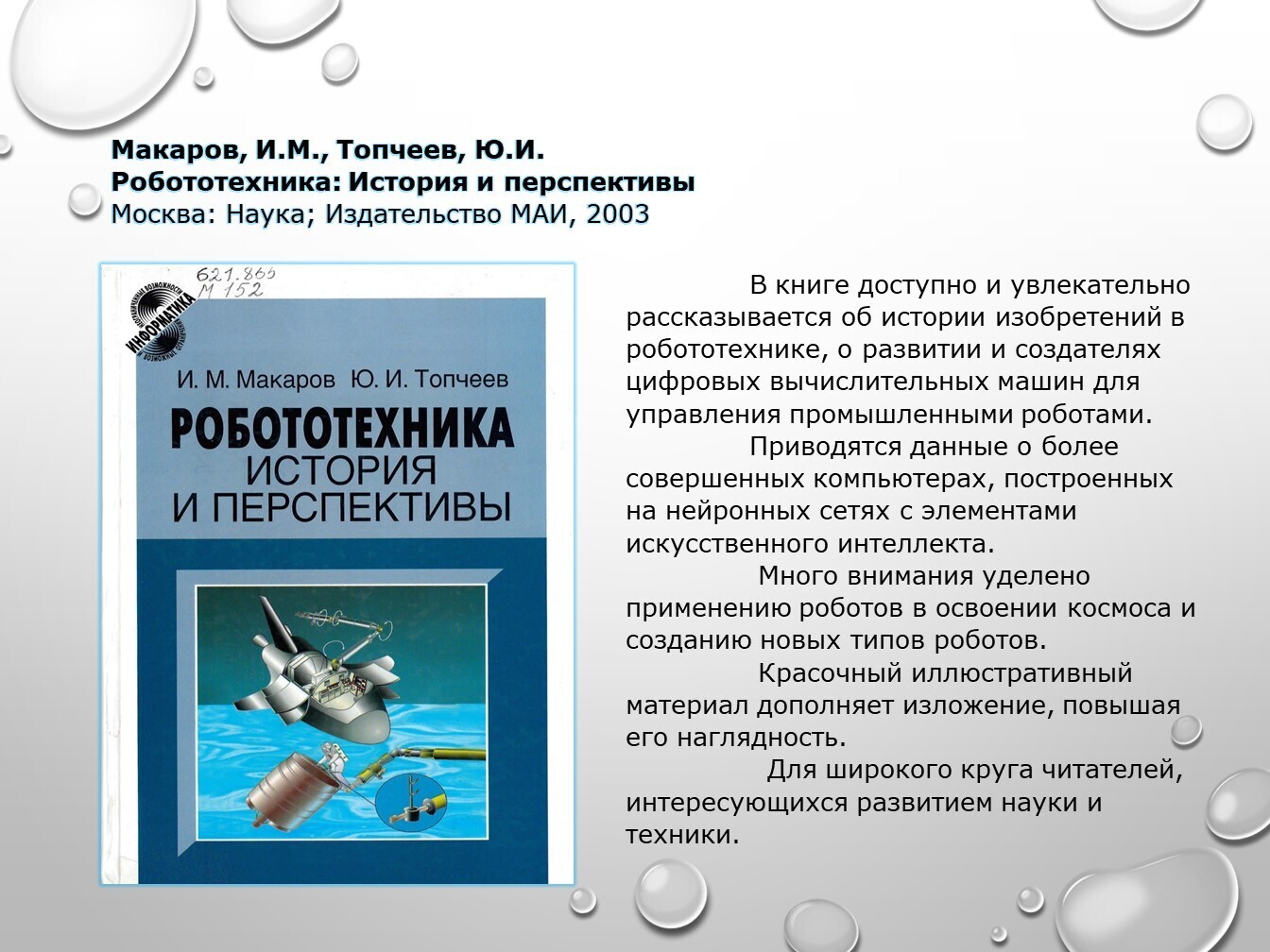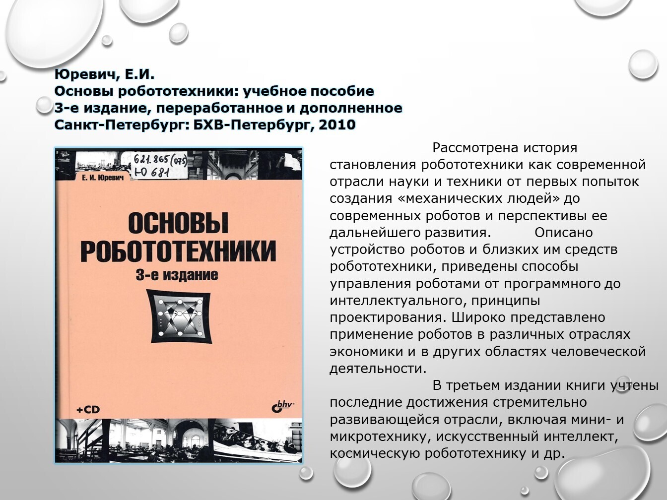 Книги, задействованные в публикации из фонда НТБ (запрашивайте книги по электронной почте ntb@minprom.gov.ru или через электронный каталог)1. Иванов, А.А. Основы робототехники / А.А. Иванов. – Москва: ФОРУМ, 2012. – 224 с. – (Высшее образование) http://192.168.1.21/opac_pb/index.php?url=/notices/index/496125/default/58 2. Макаров, И.М. Робототехника: История и перспективы / И.М. Макаров, Ю.И. Топчеев. – Москва: Наука; Издательство МАИ, 2003. – 349 с.: ил. http://192.168.1.21/opac_pb/index.php?url=/notices/index/437781/default/61 3. Не счесть у робота профессий / П. Марш [и др.]; под ред. В.С. Гурфинкеля. – Москва: Мир, 1987. – 182 с., ил. http://192.168.1.21/opac_pb/index.php?url=/notices/index/437762/default/62 4. Пети, Ж.-П. О чем размышляют роботы? / Ж.-П. Пети. – Москва: Мир, 1987. – 72 с., ил. http://192.168.1.21/opac_pb/index.php?url=/notices/index/437756/default/63 Юревич, Е.И. Основы робототехники: учебное пособие / Е.И. Юревич. – 3-е издание, переработанное и дополненное. – Санкт-Петербург: БХВ-Петербург, 2010. – 368 с. http://192.168.1.21/opac_pb/index.php?url=/notices/index/437909/default/64# Источники, использованные при создании публикации: |