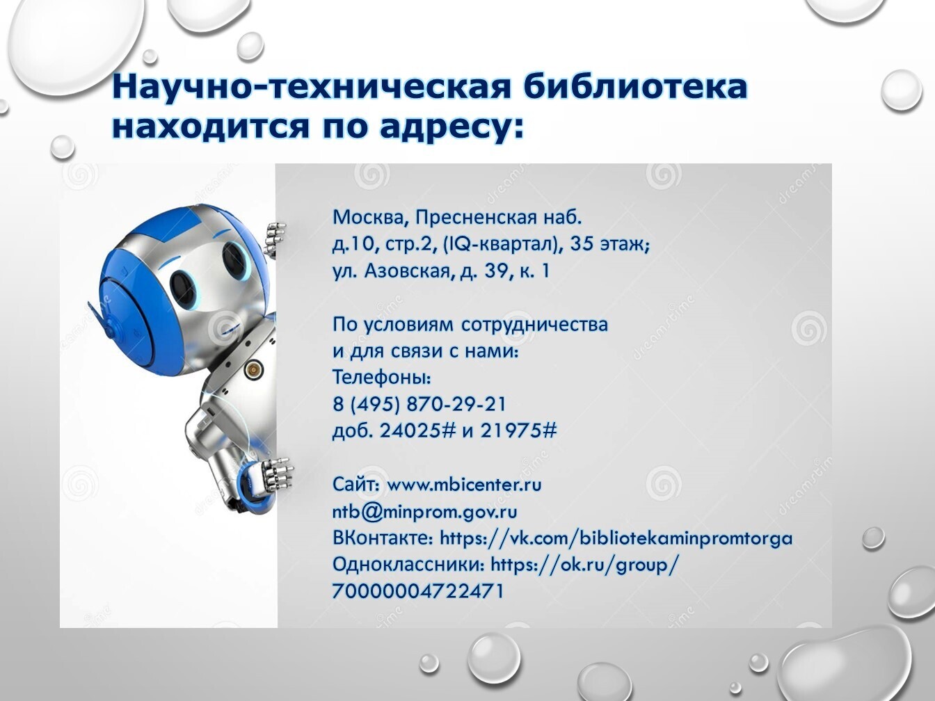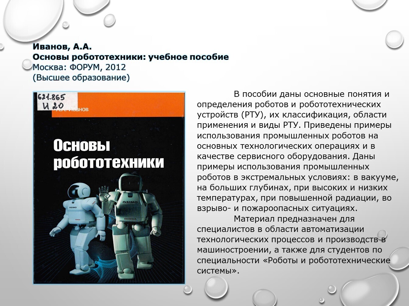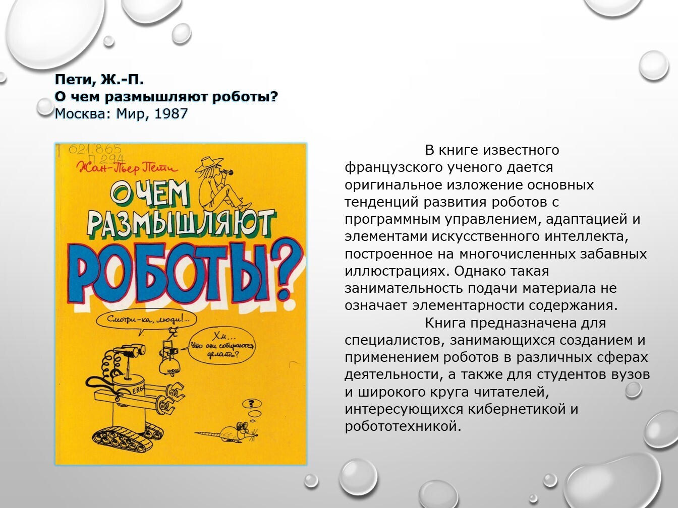 Книги, задействованные в публикации из фонда НТБ (запрашивайте книги по электронной почте ntb@minprom.gov.ru или через электронный каталог)1. Иванов, А.А. Основы робототехники / А.А. Иванов. – Москва: ФОРУМ, 2012. – 224 с. – (Высшее образование) http://192.168.1.21/opac_pb/index.php?url=/notices/index/496125/default/58 2. Макаров, И.М. Робототехника: История и перспективы / И.М. Макаров, Ю.И. Топчеев. – Москва: Наука; Издательство МАИ, 2003. – 349 с.: ил. http://192.168.1.21/opac_pb/index.php?url=/notices/index/437781/default/61 3. Не счесть у робота профессий / П. Марш [и др.]; под ред. В.С. Гурфинкеля. – Москва: Мир, 1987. – 182 с., ил. http://192.168.1.21/opac_pb/index.php?url=/notices/index/437762/default/62 4. Пети, Ж.-П. О чем размышляют роботы? / Ж.-П. Пети. – Москва: Мир, 1987. – 72 с., ил. http://192.168.1.21/opac_pb/index.php?url=/notices/index/437756/default/63 Юревич, Е.И. Основы робототехники: учебное пособие / Е.И. Юревич. – 3-е издание, переработанное и дополненное. – Санкт-Петербург: БХВ-Петербург, 2010. – 368 с. http://192.168.1.21/opac_pb/index.php?url=/notices/index/437909/default/64# Источники, использованные при создании публикации: |