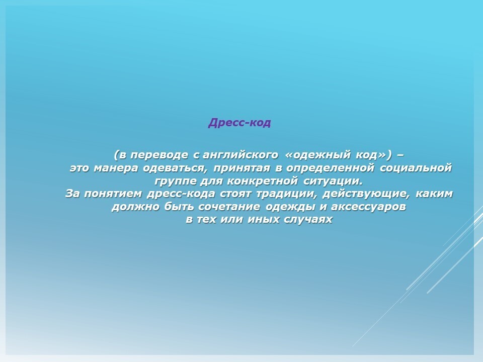 Сегодня дресс-код используется многими компаниями, сигнализируя о серьёзности, компетентности и уважении к делу со стороны сотрудников. Даже утверждается, что использование формализованной формы одежды на работе улучшает когнитивные способности и повышает их уверенность в себе.